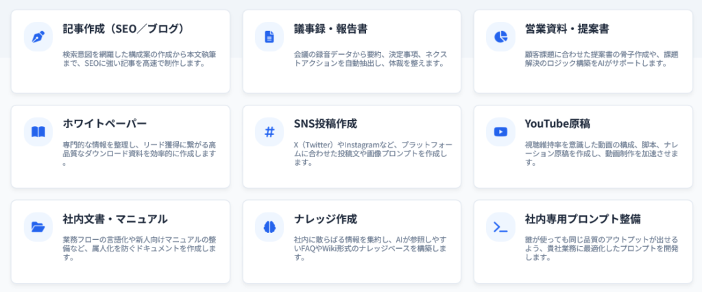 文章や資料作成業務(SEO記事、議事録、営業資料、社内文書など)を